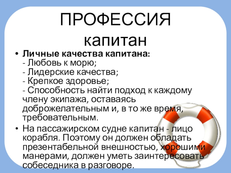 На пассажирском судне капитан - лицо корабля. Поэтому он должен обладать презентабельной внешностью, хорошими манерами, должен уметь заинтересовать собеседника в разговоре.