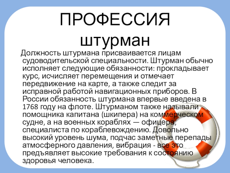 следующие обязанности: прокладывает курс, исчисляет перемещения и отмечает передвижение на карте, а также следит за исправной работой навигационных приборов. В России обязанность штурмана впервые введена в 1768 году на флоте. Штурманом также называли помощника капитана (шкипера) на коммерческом судне, а на военных кораблях — офицера, специалиста по кораблевождению. Довольно высокий уровень шума, подчас заметные перепады атмосферного давления, вибрация - все это предъявляет высокие требования к состоянию здоровья человека.