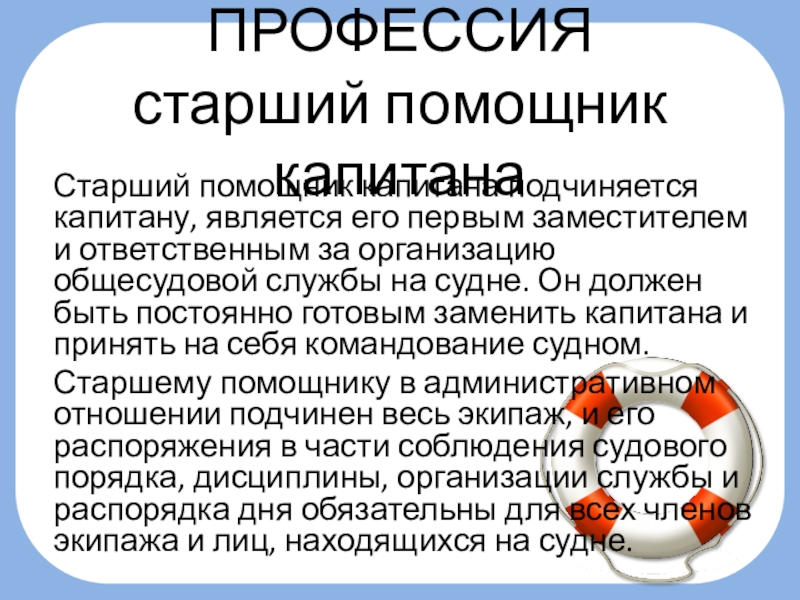 первым заместителем и ответственным за организацию общесудовой службы на судне. Он должен быть постоянно готовым заменить капитана и принять на себя командование судном.