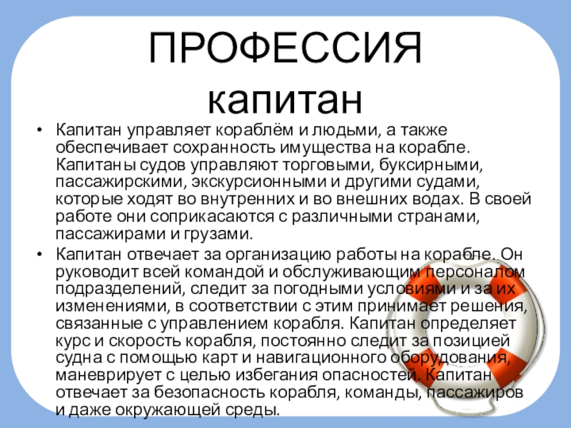 Капитаны судов управляют торговыми, буксирными, пассажирскими, экскурсионными и другими судами, которые ходят во внутренних и во внешних водах. В своей работе они соприкасаются с различными странами, пассажирами и грузами.