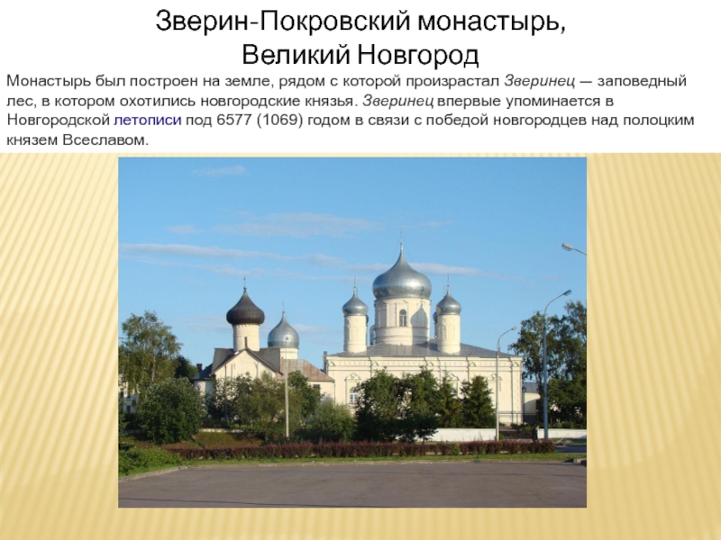 заповедный лес, в котором охотились новгородские князья. Зверинец впервые упоминается в Новгородской летописи под 6577 (1069) годом в связи с победой новгородцев над полоцким князем Всеславом.