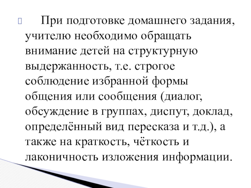 детей на структурную выдержанность, т.е. строгое соблюдение избранной формы общения или сообщения (диалог, обсуждение в группах, диспут, доклад, определённый вид пересказа и т.д.), а также на краткость, чёткость и лаконичность изложения информации.
