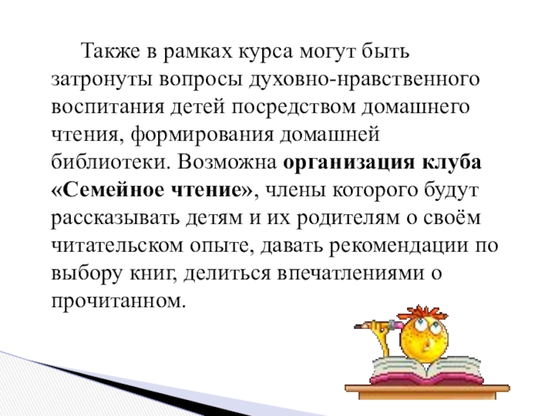 затронуты вопросы духовно-нравственного воспитания детей посредством домашнего чтения, формирования домашней библиотеки. Возможна организация клуба «Семейное чтение», члены которого будут рассказывать детям и их родителям о своём читательском опыте, давать рекомендации по выбору книг, делиться впечатлениями о прочитанном.