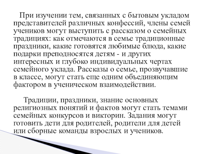 различных конфессий, члены семей учеников могут выступить с рассказом о семейных традициях: как отмечаются в семье традиционные праздники, какие готовятся любимые блюда, какие подарки преподносятся детям - и других интересных и глубоко индивидуальных чертах семейного уклада. Рассказы о семье, прозвучавшие в классе, могут стать еще одним объединяющим фактором в ученическом взаимодействии.