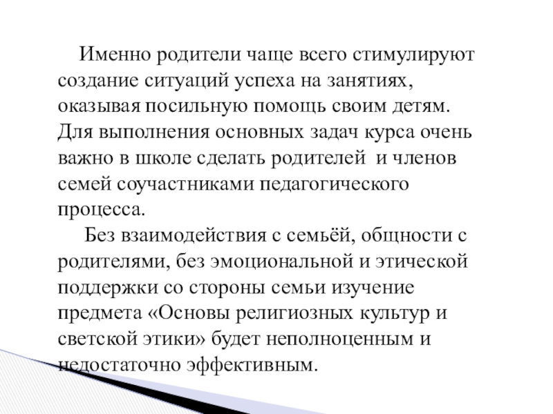 Для выполнения основных задач курса очень важно в школе сделать родителей и членов семей соучастниками педагогического процесса.