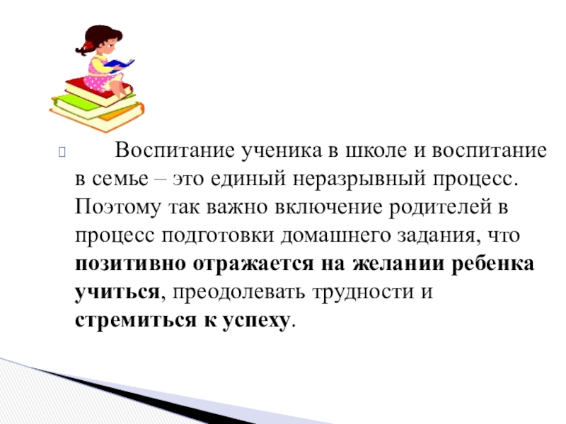 – это единый неразрывный процесс. Поэтому так важно включение родителей в процесс подготовки домашнего задания, что позитивно отражается на желании ребенка учиться, преодолевать трудности и стремиться к успеху.