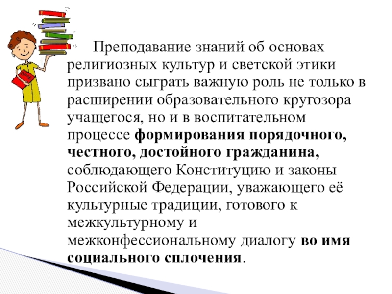 светской этики призвано сыграть важную роль не только в расширении образовательного кругозора учащегося, но и в воспитательном процессе формирования порядочного, честного, достойного гражданина, соблюдающего Конституцию и законы Российской Федерации, уважающего её культурные традиции, готового к межкультурному и межконфессиональному диалогу во имя социального сплочения.