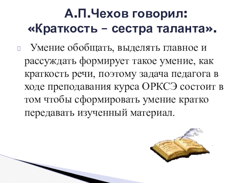 краткость речи, поэтому задача педагога в ходе преподавания курса ОРКСЭ состоит в том чтобы сформировать умение кратко передавать изученный материал.
