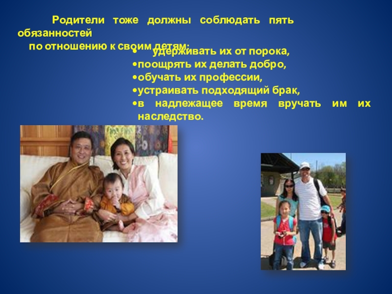 исполнять свой религиозный долг и приносить религиозные дары родителям даже после их смерти.