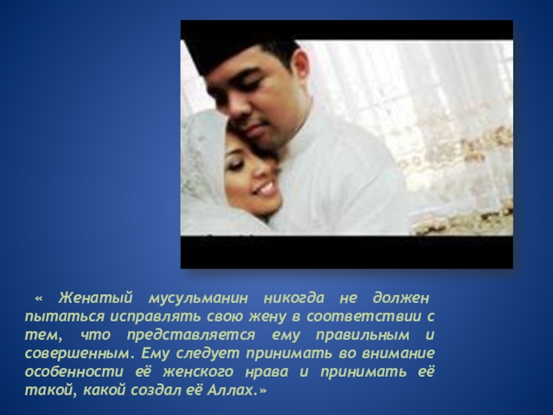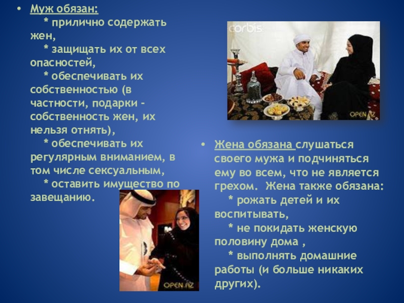 Жена обязана слушаться своего мужа и подчиняться ему во всем, что не является грехом. Жена также обязана: