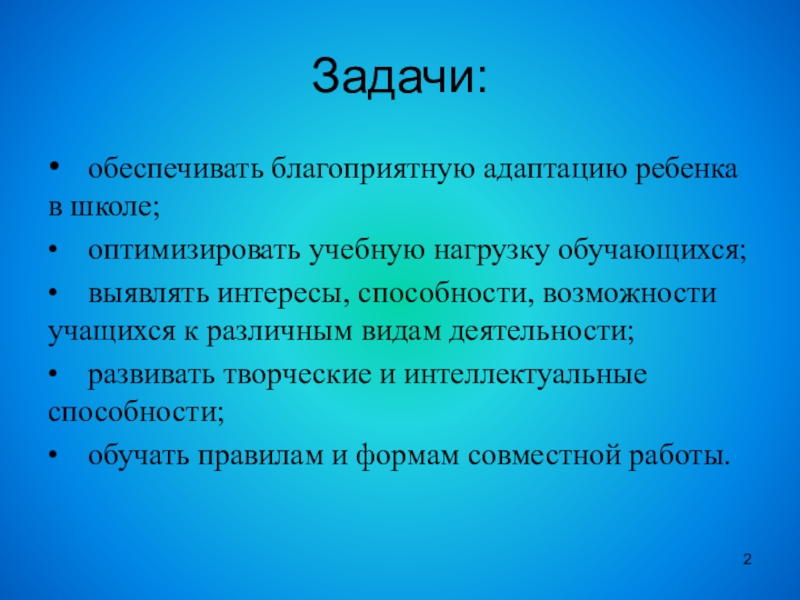 Задачи:•	обеспечивать благоприятную адаптацию ребенка в школе; •	оптимизировать учебную нагрузку обучающихся; •	выявлять интересы, способности, возможности учащихся к различным
