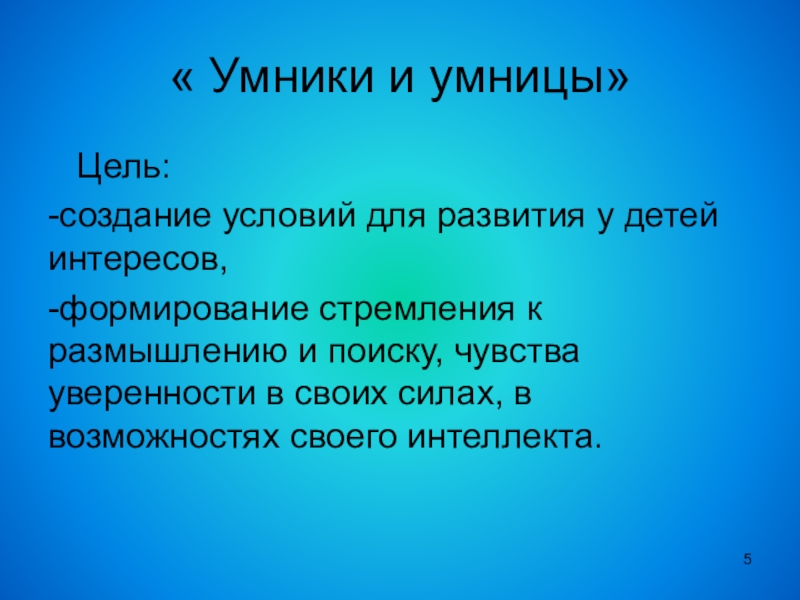 « Умники и умницы»  Цель:-создание условий для развития у детей интересов, -формирование стремления к размышлению и