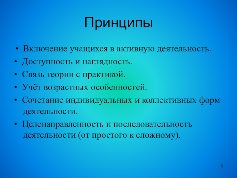 ПринципыВключение учащихся в активную деятельность.• Доступность и наглядность.• Связь теории с практикой.• Учёт возрастных особенностей.• Сочетание индивидуальных