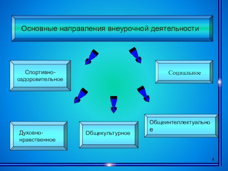 Основные направления внеурочной деятельности Спортивно-оздоровительноеОбщеинтеллектуальноеДуховно-нравственное СоциальноеОбщекультурное
