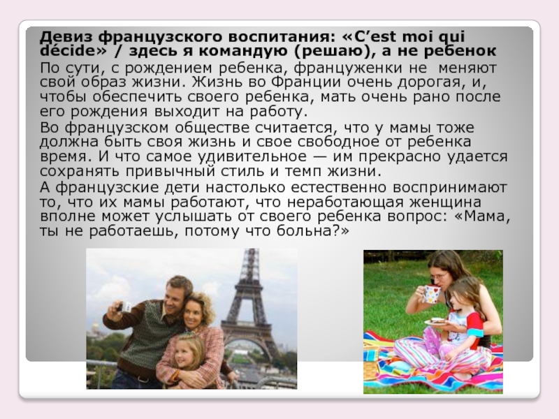 Слайд 13Девиз французского воспитания: «C’est moi qui décide» / здесь я командую