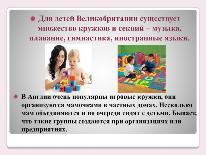 В Англии очень популярны игровые кружки, они организуются мамочками в частных домах. Несколько мам объединяются и по очереди сидят с детьми. Бывает, что такие группы создаются при организациях или предприятиях.