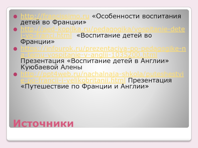 https://infourok.ru/prezentaciya-po-pedagogike-na-temu-vospitanie-v-anglii-1035200.html Презентация