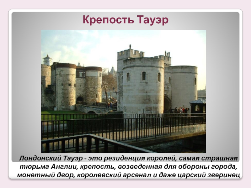 Слайд 23Лондонский Тауэр - это резиденция королей, самая страшная тюрьма Англии, крепость,