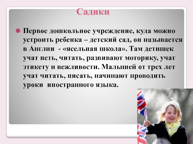 называется в Англии - «ясельная школа». Там детишек учат петь, читать, развивают моторику, учат этикету и вежливости. Малышей от трех лет учат читать, писать, начинают проводить уроки иностранного языка.