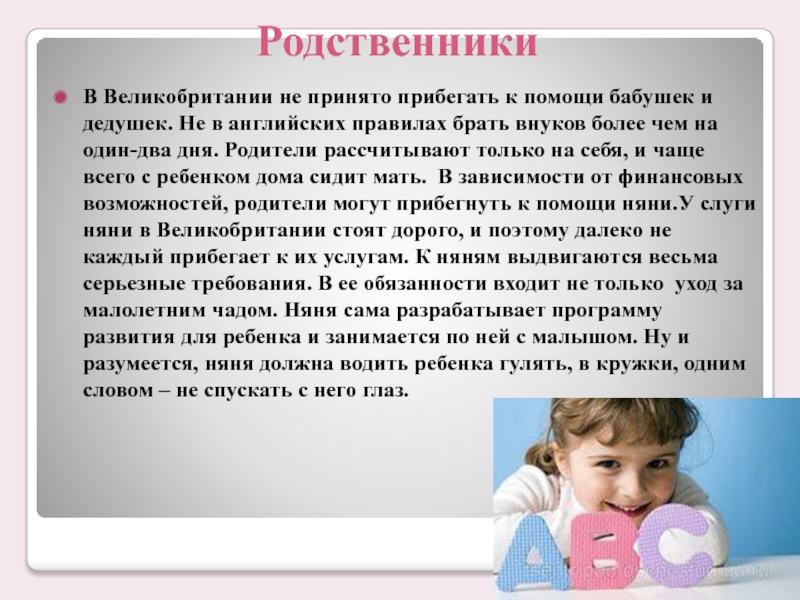 в английских правилах брать внуков более чем на один-два дня. Родители рассчитывают только на себя, и чаще всего с ребенком дома сидит мать. В зависимости от финансовых возможностей, родители могут прибегнуть к помощи няни.У слуги няни в Великобритании стоят дорого, и поэтому далеко не каждый прибегает к их услугам. К няням выдвигаются весьма серьезные требования. В ее обязанности входит не только уход за малолетним чадом. Няня сама разрабатывает программу развития для ребенка и занимается по ней с малышом. Ну и разумеется, няня должна водить ребенка гулять, в кружки, одним словом – не спускать с него глаз.