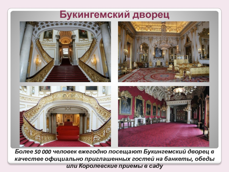 Слайд 21Более 50 000 человек ежегодно посещают Букингемский дворец в качестве официально