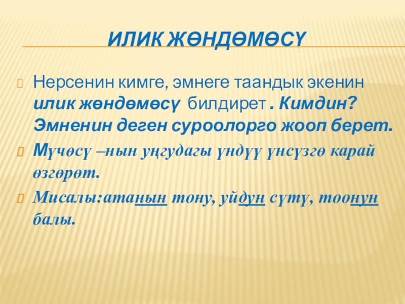 Нерсенин кимге, эмнеге таандык экенин илик жөндөмөсү билдирет . Кимдин?