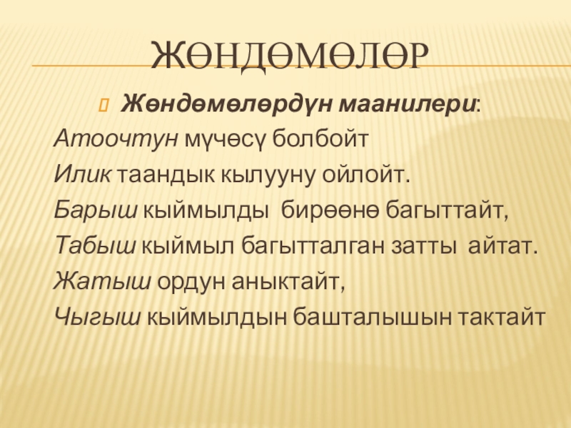 жөндөмөлөрЖөндөмөлөрдүн маанилери:	Атоочтун мүчөсү болбойт	Илик таандык кылууну ойлойт.	Барыш кыймылды бирөөнө багыттайт,	Табыш кыймыл багытталган затты айтат.	Жатыш ордун аныктайт,	Чыгыш кыймылдын