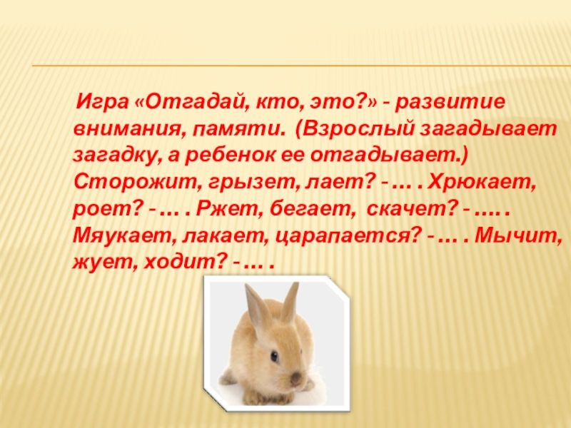 Слайд 7 Игра «Отгадай, кто, это?» - развитие внимания, памяти. (Взрослый загадывает