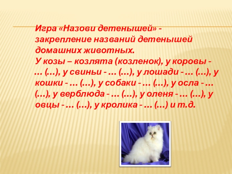 Слайд 6Игра «Назови детенышей» - закрепление названий детенышей домашних животных.