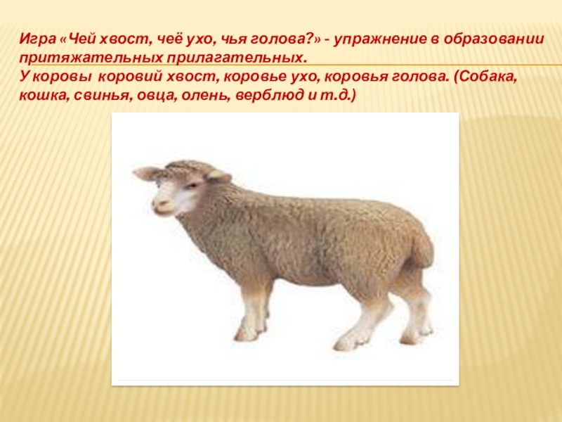 притяжательных прилагательных. У коровы коровий хвост, коровье ухо, коровья голова. (Собака, кошка, свинья, овца, олень, верблюд и т.д.)
