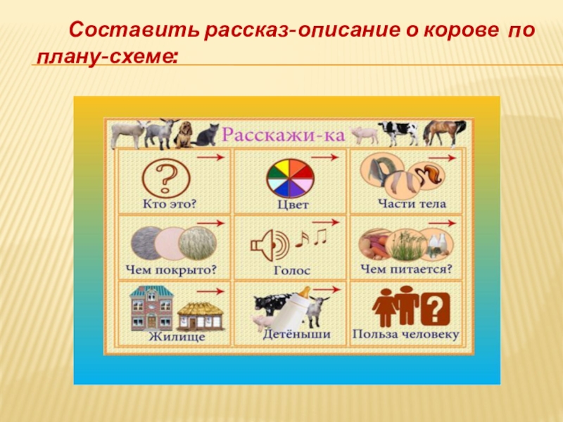 Слайд 8 Составить рассказ-описание о корове по плану-схеме: