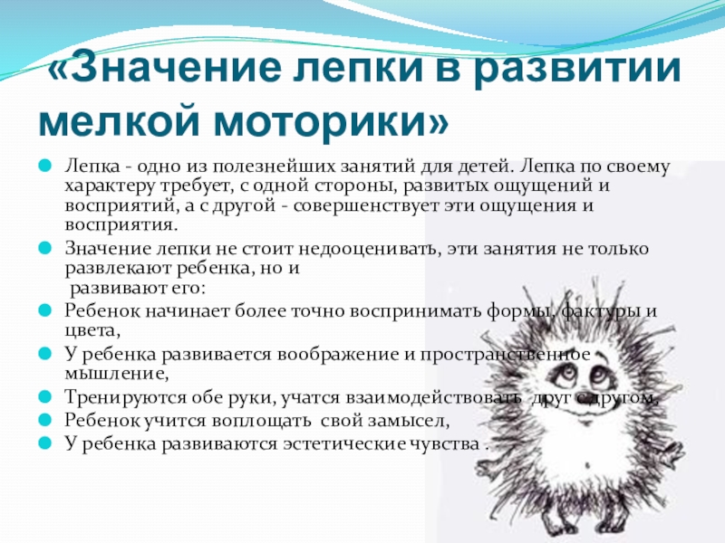 Слайд 2 «Значение лепки в развитии мелкой моторики»