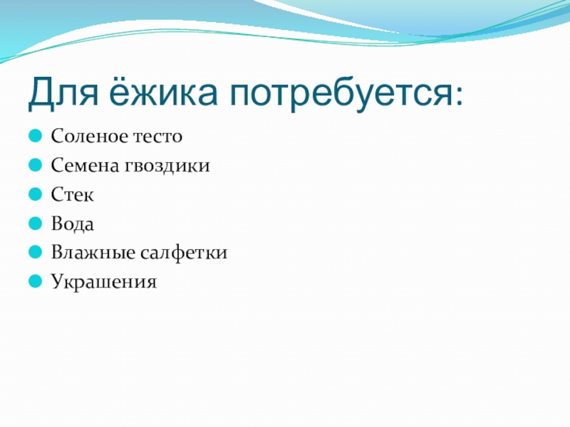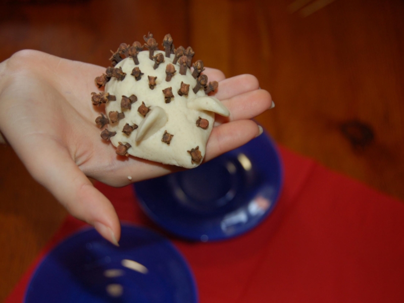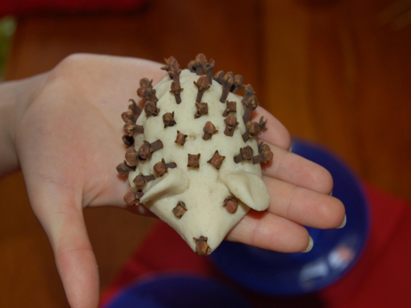 Для ёжика потребуется:Соленое тестоСемена гвоздикиСтекВодаВлажные салфеткиУкрашения