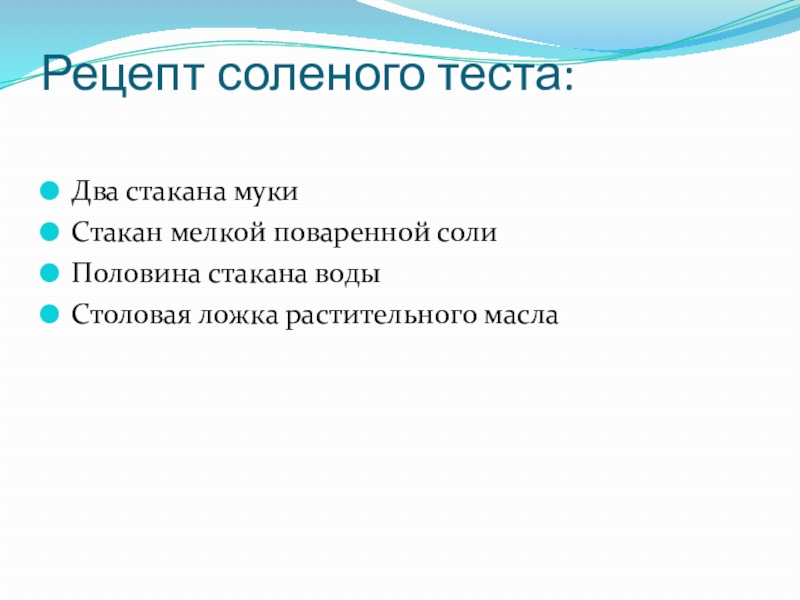 Рецепт соленого теста: Два стакана мукиСтакан мелкой поваренной солиПоловина стакана водыСтоловая ложка растительного масла