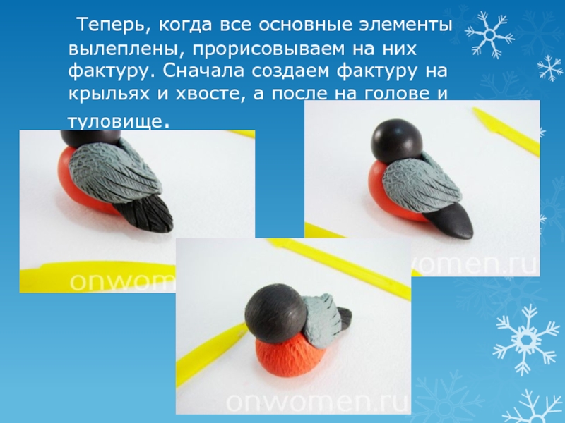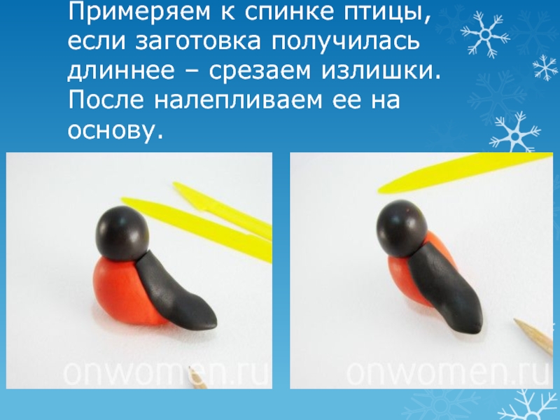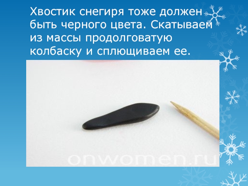 Слайд 8Хвостик снегиря тоже должен быть черного цвета. Скатываем из массы продолговатую