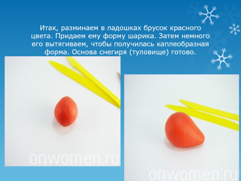 Итак, разминаем в ладошках брусок красного цвета. Придаем ему форму шарика. Затем немного его вытягиваем, чтобы получилась