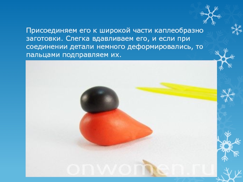 Слайд 7Присоединяем его к широкой части каплеобразно заготовки. Слегка вдавливаем его, и