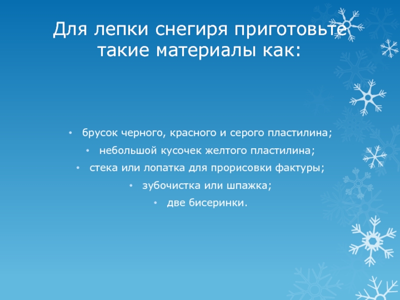 Слайд 4Для лепки снегиря приготовьте такие материалы как: