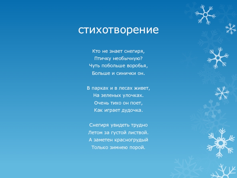 стихотворениеКто не знает снегиря,Птичку необычную?Чуть побольше воробья,Больше и синички он.В парках и в лесах живет,На зеленых улочках.Очень
