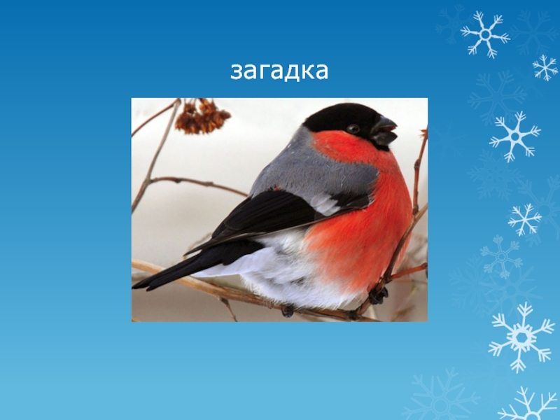 загадкаКрасногрудый красавец в садуКувыркался в пушистом снегу,А потом он на веточку сел,Засвистел и тихонько запел.– Кто зимою