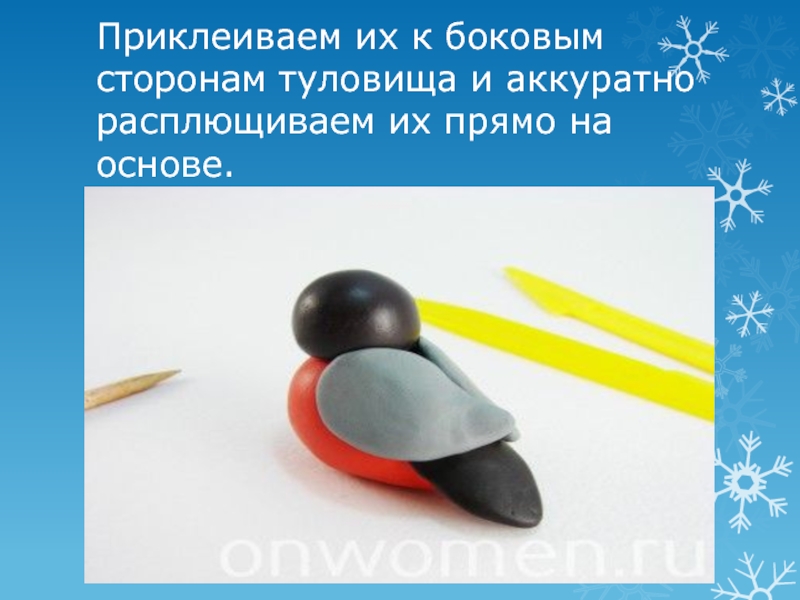 Слайд 11Приклеиваем их к боковым сторонам туловища и аккуратно расплющиваем их прямо
