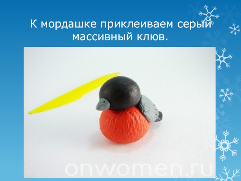 Слайд 13К мордашке приклеиваем серый массивный клюв.
