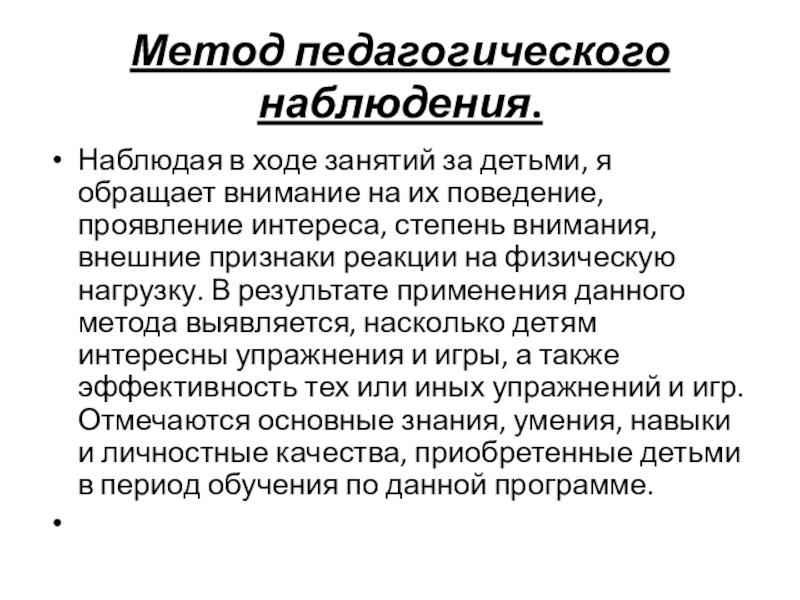 на их поведение, проявление интереса, степень внимания, внешние признаки реакции на физическую нагрузку. В результате применения данного метода выявляется, насколько детям интересны упражнения и игры, а также эффективность тех или иных упражнений и игр. Отмечаются основные знания, умения, навыки и личностные качества, приобретенные детьми в период обучения по данной программе.