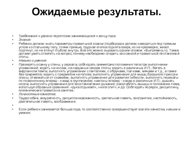 Проверять осанку у стены, у зеркала; соблюдать симметрию положения тела при выполнении упражнений; ходить на носках, на наружных сводах стопы; ходить в различных И.П.; бегать в медленном темпе; выполнять упражнении с гантелями, с обручами, палками, мячами и т.д., а также без предметов; ходить с предметом на голове; выполнять упражнения для мышц брюшного пресса и спины, отжиматься от скамейки, выполнять упражнения для развития гибкости; выполнять перекаты по позвоночнику вперед – назад в группировке, наклоны вперед – назад в различных И.П.; дышать носом, выполнять упражнения для восстановления дыхания; расслаблять мышцы в положении лежа, используя образные сравнения: «рука отдыхает», «нога спит», и др. Соблюдать порядок, дисциплину, гигиенические правила на занятии.
