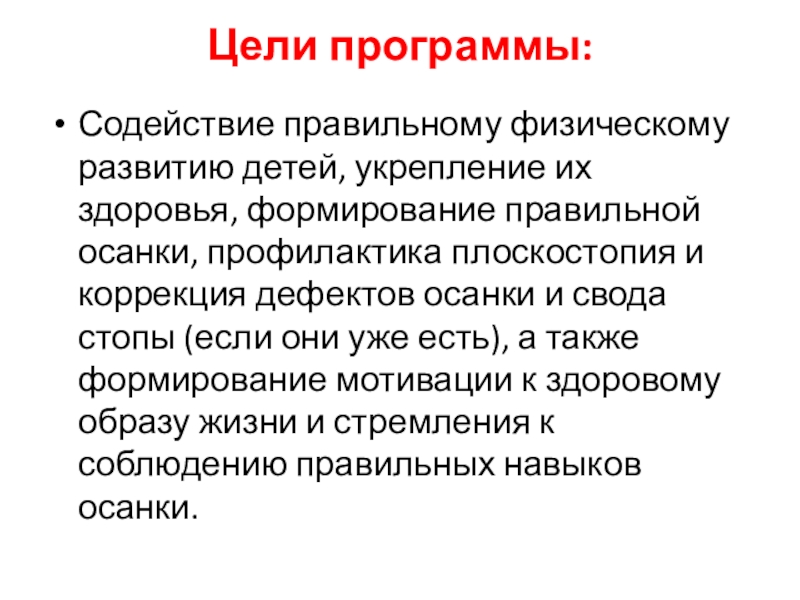 профилактика плоскостопия и коррекция дефектов осанки и свода стопы (если они уже есть), а также формирование мотивации к здоровому образу жизни и стремления к соблюдению правильных навыков осанки.
