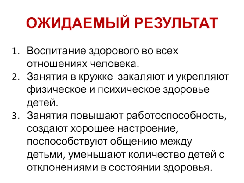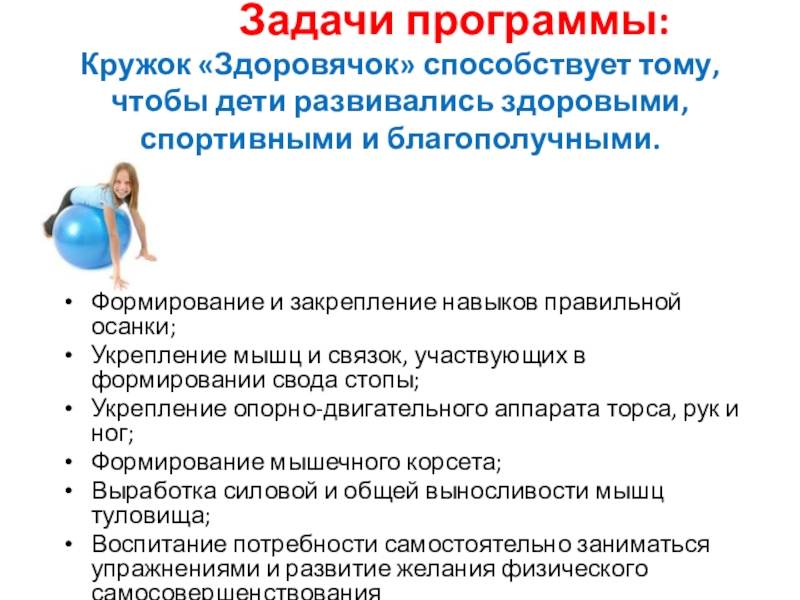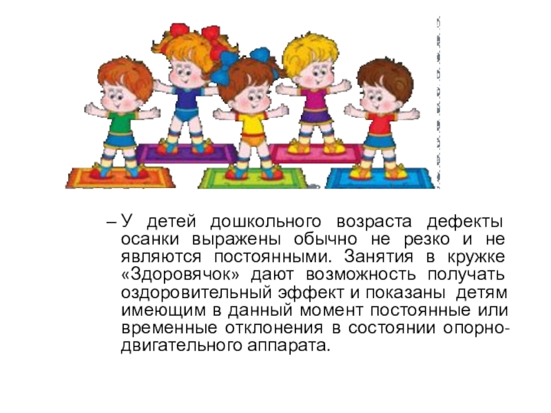 не резко и не являются постоянными. Занятия в кружке «Здоровячок» дают возможность получать оздоровительный эффект и показаны детям имеющим в данный момент постоянные или временные отклонения в состоянии опорно-двигательного аппарата.