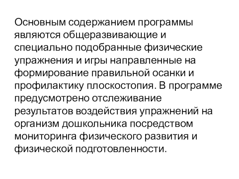 игры направленные на формирование правильной осанки и профилактику плоскостопия. В программе предусмотрено отслеживание результатов воздействия упражнений на организм дошкольника посредством мониторинга физического развития и физической подготовленности.