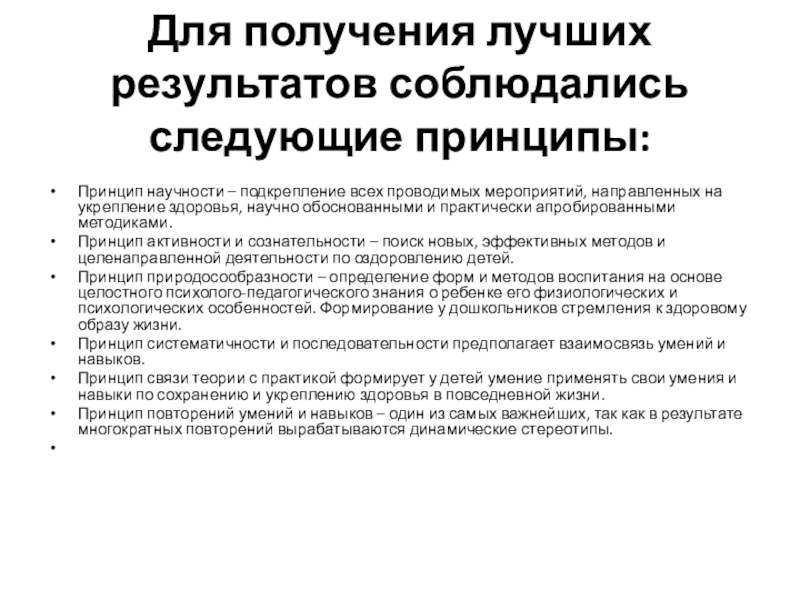 Слайд 8Для получения лучших результатов соблюдались следующие принципы: