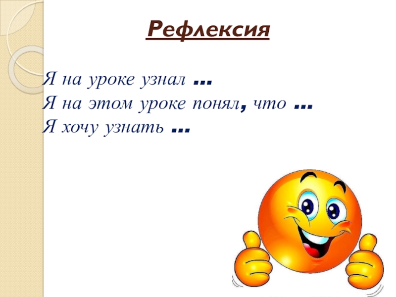 РефлексияЯ на уроке узнал …Я на этом уроке понял, что …Я хочу узнать …