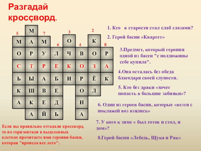 Если вы правильно отгадали кроссворд, то по горизонтали в выделенных клетках прочитаете имя героини басни, которая "пропела все лето".